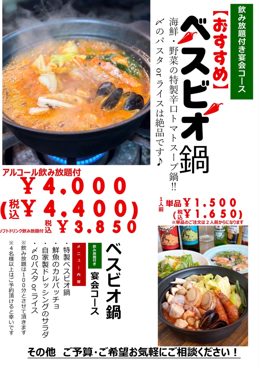 【🍽 ベスビオ鍋宴会コース(飲み放題付き)】